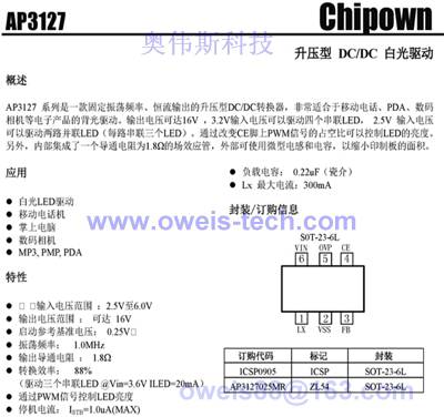 AP3127 SOT23-6 boost串联3~6 LED驱动, 0.25v反馈电压 可替换型号 RT9271、PT4101