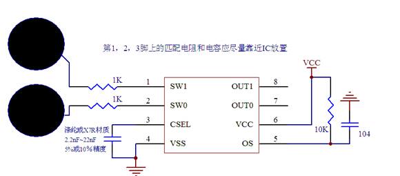 按键灵敏度调节方式: 改变基准电容CSEL 的值可对按键的灵敏度进行调节