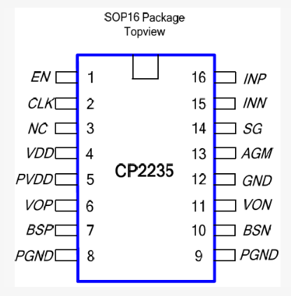 CP2235为一款高效中功率D类音频放大器,采用双电源供电,低电源VDD工作范围3.5V至5V,功率电源PVDD工作范围7V至25V。在16V电源电压下可输出峰值达18W的输出功率(8欧姆负载、10%THD+N)。CP2235内集成自动增益管理单元(AGM),可通过将外部AGM端口拉高来使能AGM模式,AGM启用后可有效抑制破音现象的发生,提供更舒适的音响效果。通过SG引脚配置高低两种增益模式,可以使CP2235满足宽电源电压范围下的不同增益应用。CP2235采用16引脚的SOP封装,可以通过外部输入电阻调节增益。CP2235内置三角波频率默认300KHz,也可以由CLK引脚外接时钟来产生三角波进行音频调制,在一些特殊环境下应用能够防止因系统在不同时钟下工作带来的混频问题。CP2235内集成了有效的EMI抑制架构设计,很好的控制了边沿速率及过冲,在无输出滤波器的环境下也能提供优秀的系统兼容性。高达70dB的PSRR,宽范围的工作电源电压、较少的外部元件,有效全面的保护使得CP2235非常适合在LCD-TV及中功率音响中应用