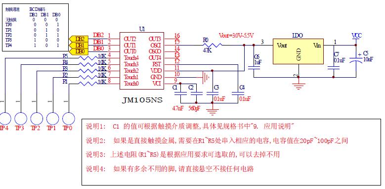 JM105NS是一款有5个独立的电容式触摸感应通道和6个I/O端口的8位专用集成电路。