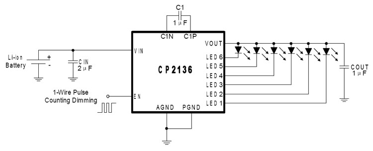 | CP2136-六通道、一线脉冲计数调光、高效率1 倍2 倍自适应 切换共阳并联LED 驱动器 |