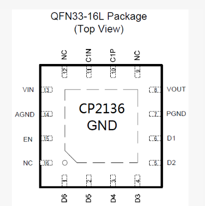 3.CP2136(强力推荐**) 电荷泵型 一线脉冲计数调光、6路1X/2X自适应电荷泵型LED驱动器(对于大屏使用5,6路LED都可以使用,性价比高) QFN16L