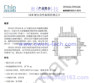 1.CP2532 SPI/IIC 12通道 多功能、宽工作电压范围、12键电容性触摸检测芯片 LQFP44, QFN40