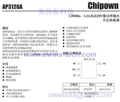 AP3127 SOT23-6 boost串联3~6 LED驱动, 0.25v反馈电压 可替换型号 RT9271、PT4101