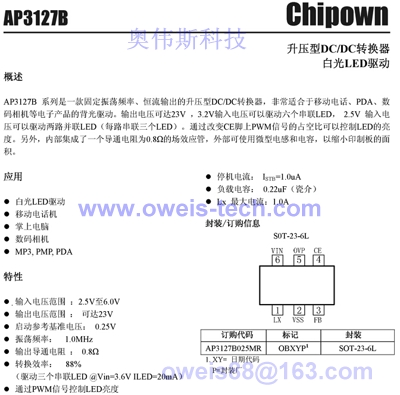 AP3127 SOT23-6 boost串联3~6 LED驱动, 0.25v反馈电压 可替换型号 RT9271、PT4101