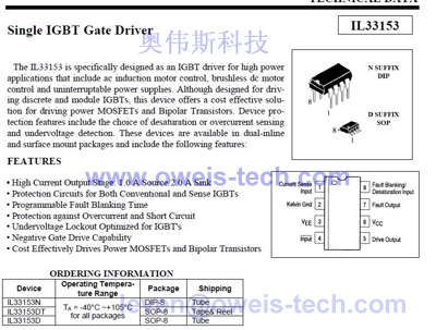 IL33153专为高功率应用的IGBT驱动器而设计,包括交流感应电机控制,无刷直流电机控制和不间断电源。 虽然该器件专为驱动分立和模块IGBT而设计,但为驱动功率MOSFET和双极晶体管提供了成本效益的解决方案。 器件保护功能包括选择去饱和或过流检测和欠压检测。 这些器件具有双列直插式和表面贴装封装,并包括以下功能: