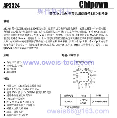 AP3324 QFN16 (3x3) 1MHz 1x/1.5x Charge Pump 4 并联LED驱动 可替换型号CP2133、PT4303、ZCC8009