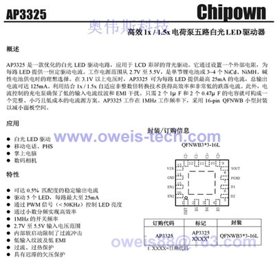 AP3325 QFN16 (3x3) 1MHz 1x/1.5x Charge Pump 5 并联LED驱动 可替换型号TPS60230
