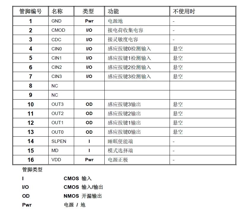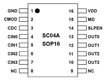 SC04A 是带自校正的容性触摸感应器,可以检测4 个感应盘是否被触摸。它可以通过任何非导电介质(如