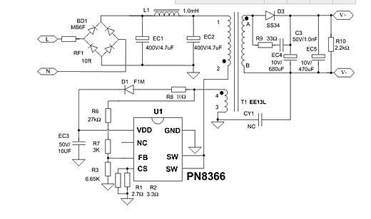 电路具有过载保护,过流保护,开环保护,以及VDD过压保护等功能,以提高整个系统的可靠性。待机小于50mW,动态性能好,可满足六级能效,此方案亮点省略RCD元件。