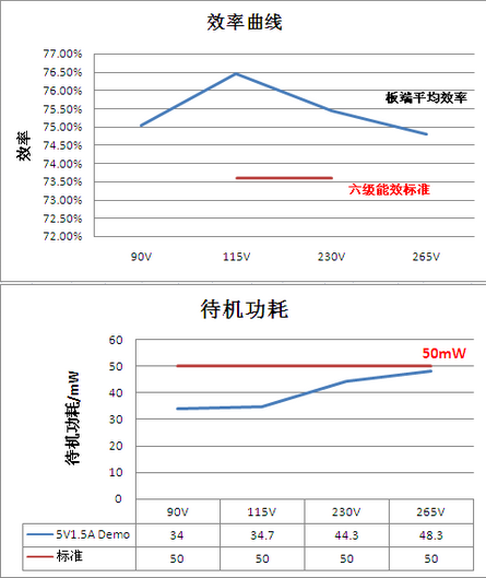 ·平均效率:115V 和230V 输入平均效率(PCB 端)满足六级能效73.6%,裕量充足