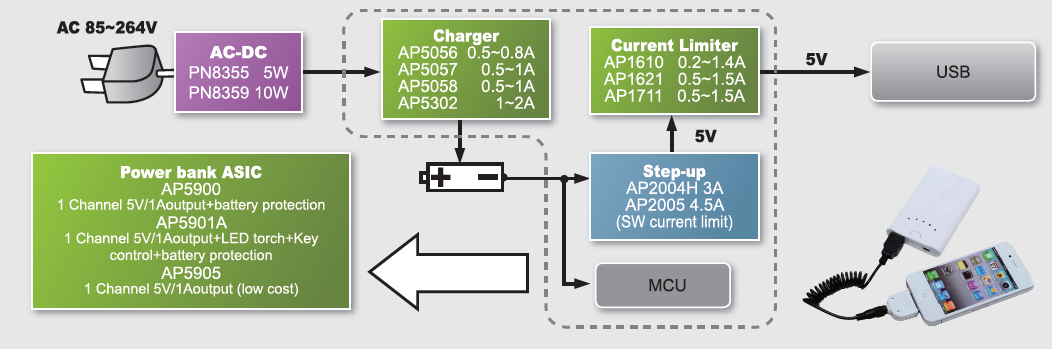 Chipown是业内领先的手持设备电源管理方案的供应商。我们可以为您的移动电源系统提供分立式系统方案,包括AC/DC、升压DC/DC、USB限流、锂电充电管理等全系列的电源管理芯片产品,此外我们为客户提供集成了线性锂电充电,电量指示,异步升压的三合一内置MCU的移动电源专用芯片,大幅减少BOM数量,减少PCB面积。