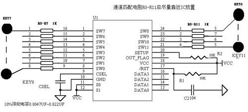 按键灵敏度调节方式: 改变基准电容CSEL 的值可对按键的灵敏度进行调节