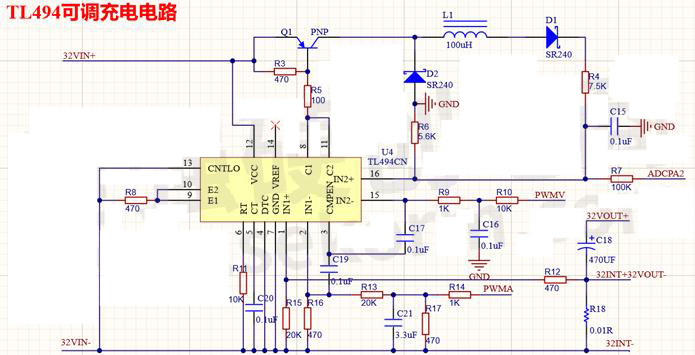 充电电路的主要功能是通过 PWM 控制输出稳定的电压,该电路采用TL494CN芯片作为调压调流芯片,该芯片具有宽电压的输入,输入电压范围为 7~40 V。