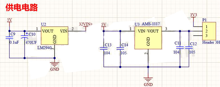 系统供电采用太阳电池板转化得到的电能作为供电来源,通过LM2940-5.0稳压电路进行降压获得5V电压,供5V电压需要芯片和电路使用;利用AMS1117-3.3芯片设计稳压电路进行二级降压获得3.3V电压为CKS32F103C8T6进行供电,为各电路和芯片提供稳定的电压,使电路稳定运行。