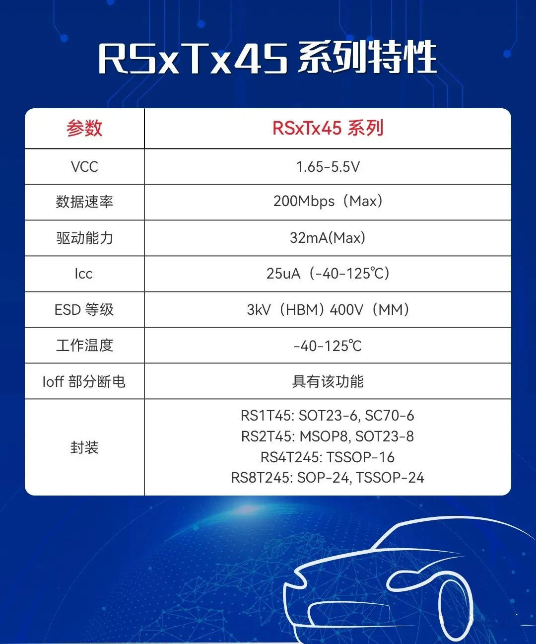 RSxTx45系列也是提供1、2、4、8这四种通道数和两个独立的可配置电源轨对输入信号进行升压或降压转换。