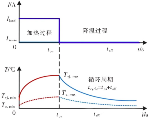 在一个循环周期内(ton+toff),被测器件加热时间或者电流开通时间为ton,电流关断时间或降温时间为toff