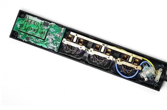 走线布局与前作相似,与前作不同的是新作使用了双面PCB,L形镂空隔离槽将PCB分割为2大部分,直角弯外为高压部分,弯内为低压部分,插线板底壳有隔离带插进PCB镂空槽以加强绝缘。