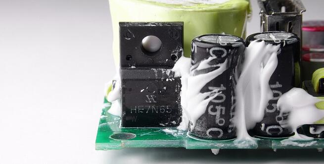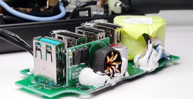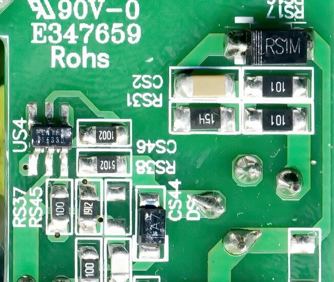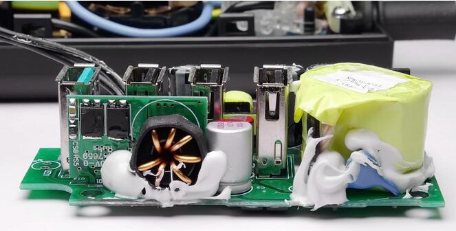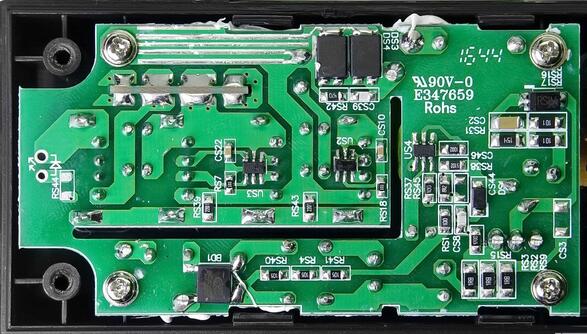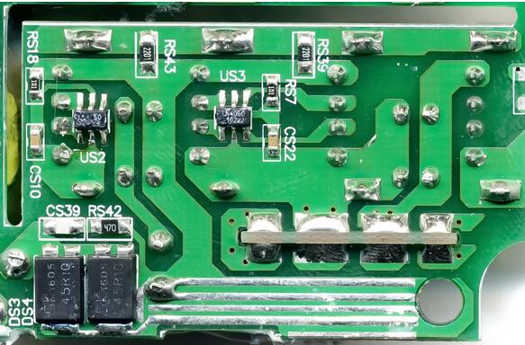 反过来看PCB正面,电路变化很大,原件密度大幅增加,高频变压器的体积也有所增加,占据了右下角较大的空间。此外另有一小块PCB板位于左下角低压区,竖直插焊在主板上。高压侧,上方从左至右,这里取消了原来的防浪涌压敏电阻,疑为空间所限无法安装。220V~经过一只方形防爆保险丝后进入整流桥,整流桥后增加了一只共模电感,共模电感前后共3只400V、15μF、105℃高压滤波电解电容。3颗6.3V固态电容负责5V低压输出滤波,总容量为1000+390μF*2=1780μF。蓝色QC3.0USB插座旁边的两颗小电解电容25V、47μF*2,负责QC3.0部分滤波输出,电容量有点小,空间所限,装不下太大的。