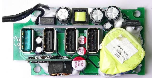 同样的4USB输出,不同的是FH60P其中有个绿色胶舌的USB插孔周围丝印了个白线框和3个闪电符号,表示其为快充QC3.0输出。USB插座的方向不同,PCB必然是经过了重新的设计。QC3.0是美国高通公司推出的快充技术,广泛运用在今年大部分中高端手机上,向下兼容QC2.0快充。