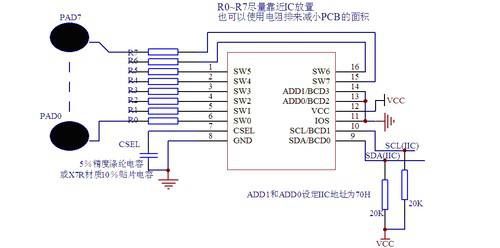 按键灵敏度调节方式: 改变基准电容CSEL 的值可对按键的灵敏度进行调节。
