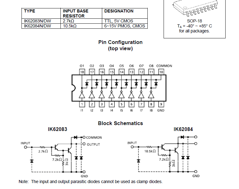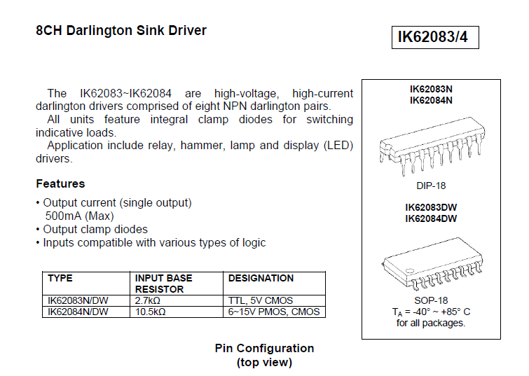 IK62083〜IK62084是由8个NPN达林顿对组成的高压大电流达赖顿驱动器。