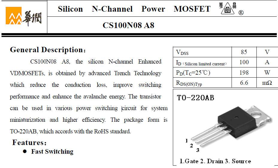 CRST065N08N 85V 121A TO-220 电动车低压MOS管