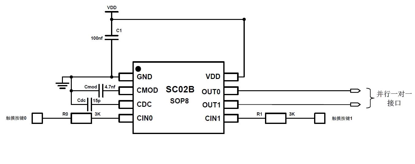 SC02B是带自校正的容性触摸感应器,可以检测2个感应盘是否被触摸。它可以通过任何非导电介质(如玻璃和塑料)来感应电容变化。这种电容感应的开关可以应用在很多电子产品上,提高产品的附加值。