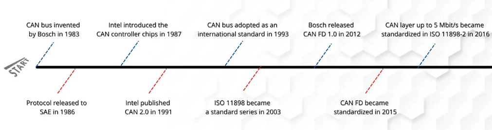 1993年,国际标准化组织(ISO)发布了CAN标准ISO 11898,CAN标准被重新编译分成两个部分:ISO 11898-1涵盖了数据链路层,ISO 11898-2涵盖了高速CAN总线的物理层