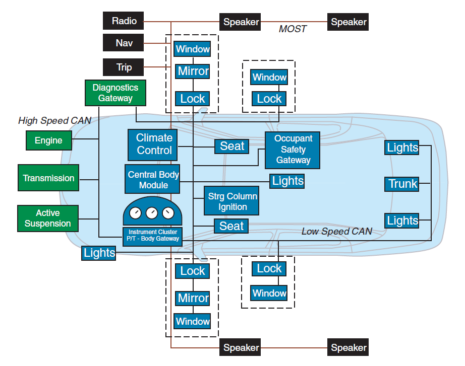 一般情况下一辆汽车上会包含高速和低速两种线路,会根据数据需求的紧急程度来确定哪些信息使用高速通信线路