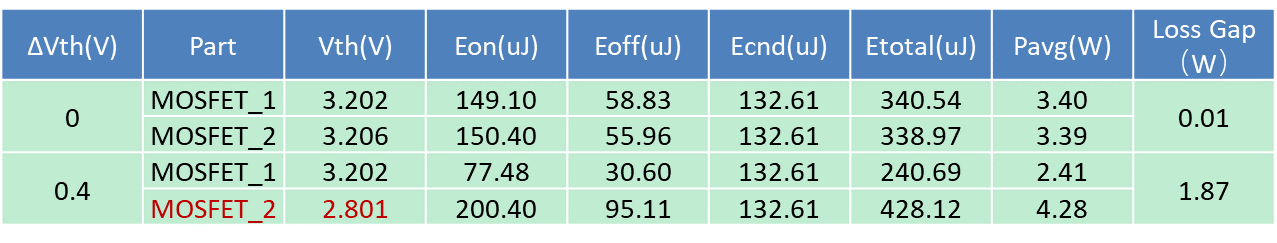 当并联的两个MOSFETs具有相同的参数,如内在阈值电压(Vth)、Rg和Ciss时,它们的开通能量(Eon)和关断能量(Eoff)非常相似,功率损耗的差距仅为0.01W。当2号MOSFET被Vth较低的器件替换时,其Eon和Eoff显著增大,功率损耗比Vth较高的1号MOSFET器件高出1.87W,如表1所示。