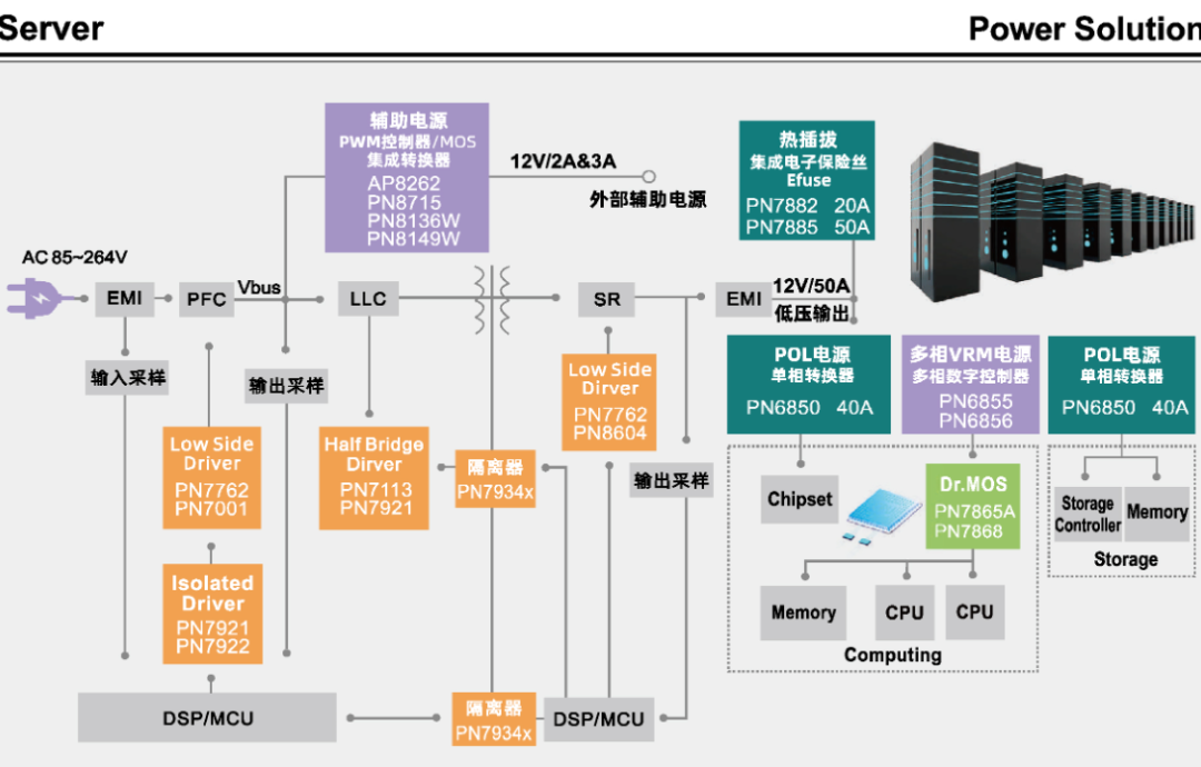 多相VRM方案:多相控制器PN6855、PN6856配合Dr.MOS PN7865A、PN7868,为CPU、AI芯片提供数百安培级供电。