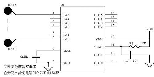 按键灵敏度调节方式: 改变基准电容CSEL 的值可对按键的灵敏度进行调节